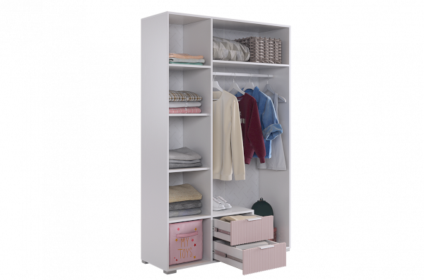 Габариты 1200х422х1900 мм обеспечат достаточное пространство для хранения одежды, белья и других предметов, а благородное белое дерево и розовая пудровая эмаль придают шкафу шарм и изысканность. Фасады из МДФ с фрезеровкой в виде вертикальных полос создают интересный и стильный акцент.