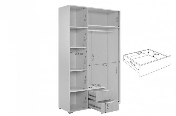Но не только его внешний вид впечатляет. Шкаф "Зефир" обладает практичным и удобным внутренним наполнением. Среднее отделение оснащено двумя ящиками с шариковыми направляющими, что позволяет легко и плавно открывать и закрывать их. А зеркальное покрытие на средней двери добавляет функциональности и помогает при выборе образа.