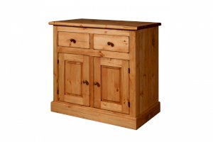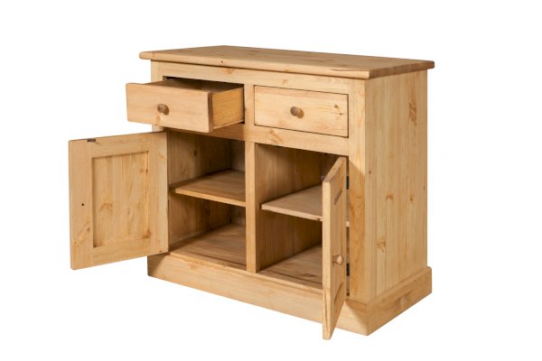 2 дверки, 2 ящика. За каждой дверкой по одной полке.