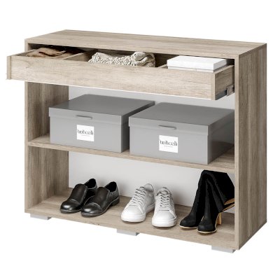Неглубокая тумба Наоми может использоваться в любой комнате вашей квартиры или дома. Модель оснащена одним выдвижным ящиком и двумя распашными дверцами, за которыми находятся полки для хранения. Изделие имеет характерную для коллекции Наоми отделку: корпус выполнен из ЛДСП в цвете дуб каньон, фасады имеют интегрированные ручки.