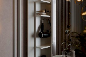Зеркальная панель трюмо работает по принципу шкафа-купе, что обеспечит вам легкий доступ к вещам, которые лежат на полках за зеркалом.