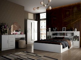 В самом названии этой спальни видится что-то мягкое, удобное и уютное. Интересное и функциональное дизайнерское решение – кровать с надстройкой – служит дополнительным местом для хранения вещей.