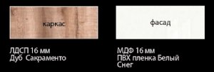 - Коллекция представлена в следующем цветовом решении: Корпус ЛДСП 16 мм  в декоре «Дуб Сакраменто» и фасад МДФ 16 мм в декоре «Белый снег глянец»