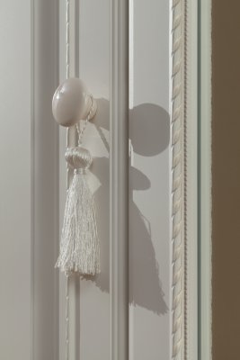 Шкаф 4-створчатый: Корпус – ЛДСП 16 мм Фасады – МДФ с пленкой ПВХ и патиной Кромка – ПВХ 0,4 мм Зеркало – 4 мм Направляющие – шариковые Ручки – фарфоровые Опоры – пятниковые Декор – кисти для штор