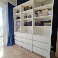 лаконичный, белый, с ящиками, высокий и глубокий, удобен для хранения и расстановки книг плюс хранение других вещей в комнате. прост в сборке - собирается за час максимум