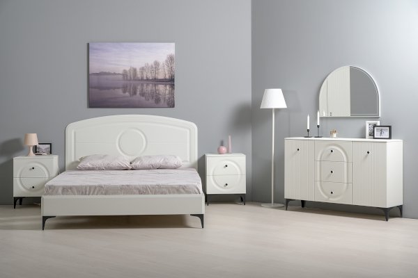 Кровать установлена на высокие ножки, что делает конструкцию лёгкой и воздушной, изголовье кровати декорировано фрезеровкой. Матрас укладывается на ортопедическое основание с гнутоклееными ламелями.