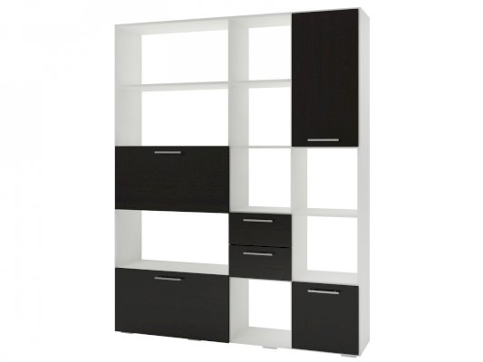 Применение задней стенки из ЛДСП (в ячейках с ящиками и фасадами) позволяет использовать данный стеллаж для зонирования пространства (чтобы предотвратить опрокидывание, необходимо обеспечить крепление стеллажа к стене).