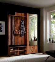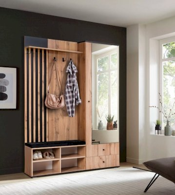 В шкафу есть открытая секция с тремя металлическими крючками, чтобы повесить верхнюю одежду. Ниже предусмотрен мягкий элемент, чтобы можно было присесть и снять обувь или просто поставить сумку. В закрытой секции - выдвижная штанга и шляпная полка. Выдвижная штанга выдерживает вес до 16 кг. Снизу предусмотрены два вместительных выдвижных ящика с шариковыми направляющими. Ящики можно использовать для хранения обуви и обувных аксессуаров.