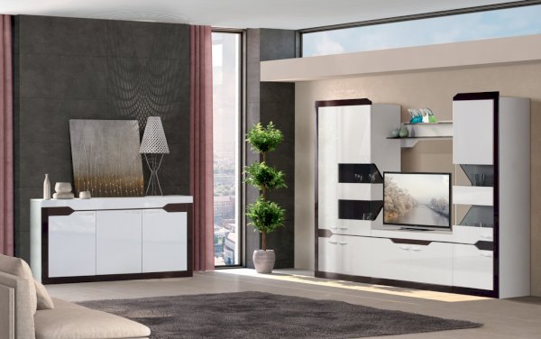 Гостиная «Ронда» – модульная мебель в современном стиле, выполненная в виде горки. Благодаря сочетанию 2-х контрастных декоров – белого и венге с глянцевыми и матовыми поверхностями, а также оригинальному дизайну двухсторонних стеклянных витрин и декоративному приему стыковки модулей, «Ронда» выглядит эффектно и стильно. Завершают внешний облик белые глянцевые ручки итальянского производства. Модель включает 6 самых востребованных модулей для гостиной комнаты: шкаф для одежды с возможностью добавления 2-х дополнительных полок, 2 шкафа многоцелевых с витринами для посуды, тумбу, полку навесную и стол журнальный. Мебель оснащена петлями с доводчиком, благодаря которым двери закрываются плавно и бесшумно, так что, можно не волноваться за стеклянные фасады. Цвет «белый/венге»
