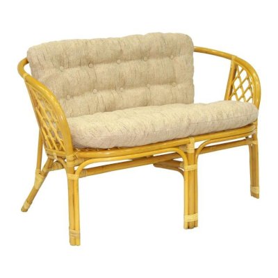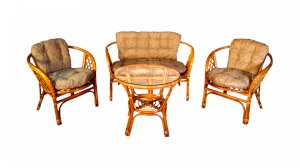 Комплект из натурального ротанга, состоящий из дивана, двух кресел и круглого столика со стеклом.