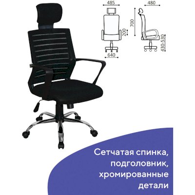 Высокая сетчатая спинка и подголовник, выраженная поддержка поясницы, прочные пластиковые подлокотники, хромированное пятилучие гарантируют комфортное долгосрочное использование.