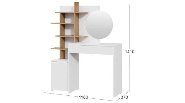 Помимо внешней привлекательности, стол достаточно вместителен. Конструкцией предусмотрено большое круглое зеркало, просторная столешница и практичный выдвижной ящик, который добавит места для необходимых мелочей. Стол также имеет открытые полки, которые позволят установить предметы декора, парфюм, украшения и многое друге.